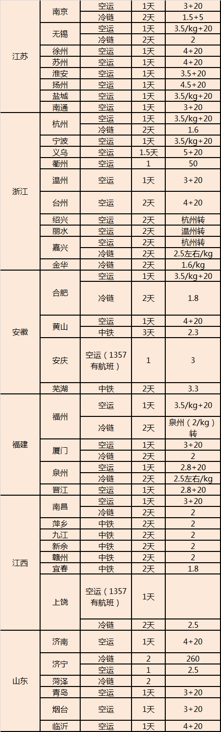 注:运输费用是变动的,节假日会有所上浮,以下仅供参考,不作为结算依据。